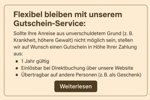 Und das Beste: Sie buchen direkt bei uns – ganz ohne Portale, ganz ohne Gebühren und als Bonus unsere Preisstaffelung – abgestimmt auf Ihre Reisedauer: